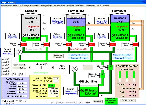 Die Steuerungssoftware bietet dem Bediener eine kompakte grafische Übersicht zu allen aktuellen Prozessen und den dazu relevanten Daten. Die einzelnen Komponenten der Biogasanlage sind schematisch dargestellt, enthalten die aktuellen Werte wie Füllstände, Temperaturen, Gasstände und Zustände der aktuell ablaufenden Prozesse. Alle Prozesse laufen, wie vom Bediener programmiert, vollautomatisch ab, können aber jederzeit beeinflusst werden. Weiterhin werden Informationen über den aktuellen Stand des BHKW (Blockheizkraftwerk), den Gasstand und die Gasqualität dargestellt. Alle Daten der Biogasanlage und des BHKW, die am Monitor aktuell visualisiert sind, werden von der Steuerung automatisch zyklisch im Minutentakt abgespeichert und können zu jeder Zeit, auch mobil über Smartphone, abgerufen werden. Die gesamte Historie kann zurückverfolgt werden.